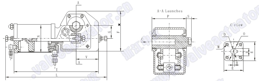 When compressed-air enter into the piston from port A, make the piston(3) push the piston stem(4)move to the right and go through the connecting stem(7)drive the crank(6)revolve 90° anti-clockwise; on the contrary, the compressed-air enter into the piston from port B, make the piston(3) push the piston stem(4)move to the left and go through the connecting stem(7)drive the crank(6)revolve 90°clockwise. To regulate a slight angle from the two sides (50), loose the nut and adjusting bolt (1) regulate to the demanded angle and lock the nut.
