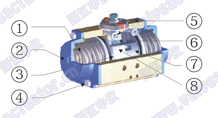 ① | Spring | Concentric telescoped spring cartridge.The standard bonderizing, high elastic and the reliability, may adapt different barometric pressure and torque, the safe long bolt, when the guarantee service safely disassembles and assembles, the DA/SR series external dimensions is same. |